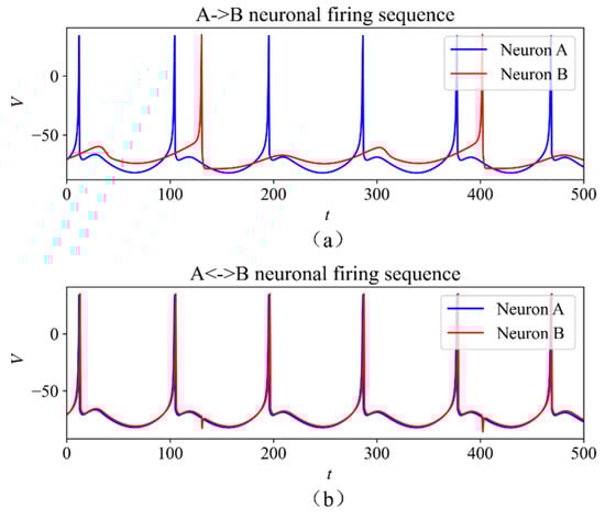 Two neuronal discharge sequences (a) Neurons A and B are unidirectional coupling; (b) Neurons A and B are dual coupling.).