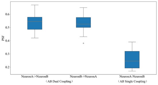 Figure 3 is a box-line plot that quantitatively portrays the values of the taken under different coupling connections. The upper and lower limits of the bins each indicate the upper and lower quartiles, the entire box indicates the dispersion of the and the line in the middle indicates the median of the dataset. Through running the experimental data 100 times, Figure 3 quantitatively describe the values under different coupling connections. For the dual coupled motif model, the exponent is higher, i.e., it shows that it is more sensitive to the phase information carried by the input information. For the single coupling model, the value is around 0.28. The smaller value indicates that the phase carried by the input information has less impact on it under this structure, i.e., the synchronization of the nodes is less affected when the stimulus information changes the carried phase, which, in turn, cannot regulate the effective links in the network.
