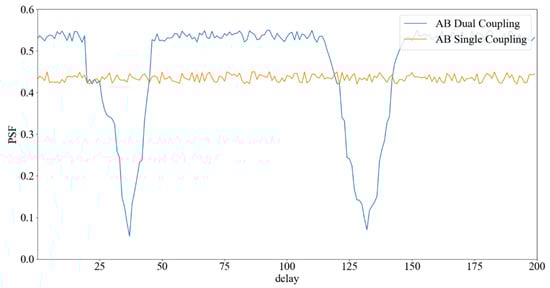 Figure 4 represents the effect under the time delay scale of . From Figure 4, it is seen that the value under single coupling fluctuates around 0.43 and does not change significantly with the increase in time delay, indicating that the phase information carried by the stimulus phase has less ability to regulate under the single coupling structure under the influence of time delay, and its coherence value is more stable. In bidirectional coupling, the value has a strong fluctuation between . With the increase in time delay, the value appears to show a trend of in-phase and inverse-to-phase changes, which shows that the synchronization of neural nodes can be regulated in-phase or inverse-to by means of time delay [17,18,19]. Therefore, exploring the effect of time delay on between coupled nodes is important to investigating the relationship between stimulus information phase shift and the selection mechanism of network paths.
