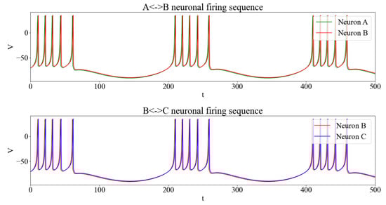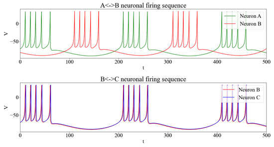 Figure 5 is a discharge sequence for three motif models. Its analysis method is similar to that of two motif models. However, in Figure 5, the discharge sequence diagrams of neurons with structural links (neuron and neuron ) and without structural links (neuron and neuron ) are simulated, respectively. It can be seen from Figure 5 that there is a certain difference in the pulse sequence between neuron and neuron , but their discharge activities are regular and consistent. Although there is no structural link between neuron and neuron , there is a phase synchronization state in the discharge sequence, which is consistent with the theoretical analysis. This shows that the synchronization state between neurons is an important means of neural information transmission. Therefore, it can be shown from Figure 5 that there is an effective transmission between neuron and neuron in the process of information transmission; synchronization characteristics can build dynamic effective links between neurons and these effective links do not necessarily correspond to structural links one by one, which may be the main reason for flexible path switching in brain networks.