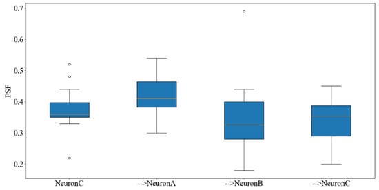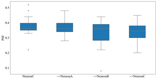 Figure 8 and Figure 9 show discharge sequences and statistical diagrams of the motif model of Figure 1(b-3), respectively. According to the consistency of the discharge sequence between neurons in Figure 8, no matter whether there is a structural link between neurons—for example, there is a structural link between neurons and , and there is no structural link between neurons and —neurons achieve isochronous synchronization in the firing process; that is, an effective link is formed between any two neuron nodes. In addition, it can be seen that the data distribution in the box diagram of Figure 9 is more stable than that of Figure 6, but the fluctuation of the value of neuron is more obvious from the box diagram, indicating that it is more easily regulated by the phase information of stimulus signal. Therefore, it is found that the synchronization between neural nodes is an important index to form an effective link, and the synchronization between neurons is regulated by many factors.