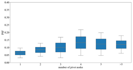 Figure 11 shows the schematic diagram of the relationship between the values of some nodes and the central nodes. It can be seen that the values of the stimulus node pairs are different between the paths passing through one central node and those passing through two nodes, which indicates that there is a certain relationship between the path choice between the stimulus information pairs and the number of central nodes. Therefore, the box diagram of Figure 12 is used to describe the influence of the number of central nodes on the index between node pairs. As can be observed from the boxplot, when and only when there is one pivot node, its value is distributed in . As the number of pivot nodes increases, the value of and the distribution interval increases; when the number of pivot nodes is four, the value of is distributed between , indicating that the data of fluctuates more, but when the number of pivot nodes is five or the number of pivot nodes is greater than five, the value of decreases and the fluctuation range becomes smaller. From the perspective of the significance of , when the number of hub nodes increases to a certain number, the values between nodes in the network can be regulated by the phase shift of the stimulus information. This shows that the path selection strategy in the network is affected not only by the phase of stimulus information, but also by the number of central nodes. Therefore, in the complex link structure composed of twenty nodes, limiting the maximum number of central nodes to five, which means that the path of up to six nodes is mainly searched in the path search, and 95% confidence interval is used for evaluation.