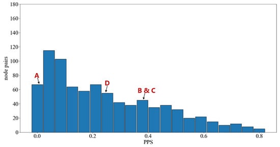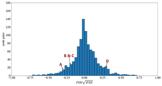 Path selectivity index PSS normalized histogram (A, B, C and D respectively corresponds to the four conditions in Figure 14.).