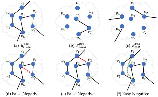 Examples of false and easy negative samples. Edges in (a–c) represent the edges in , and respectively. The missing edges, including edge in (d) and edge in (e), are sampled as negative samples, which mislead GNN models. The easily distinguishable edge in (f) is sampled as a negative sample, which contributes insufficiently to GNN models.