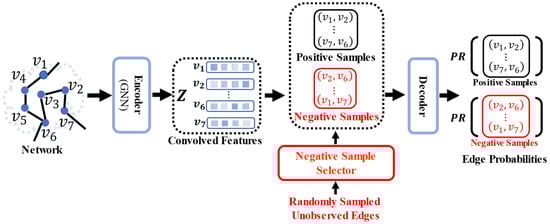 The primary goal of this work is to augment the quality of negative samples for the training of GNN models. As shown in Figure 2, a network is used as the input to the encoder. A GNN model is used as the encoder to obtain the convolved feature matrix for all nodes in the node set . Observed edges in are used as positive samples. Different from previous studies, a negative sample selector is designed to select high-quality negative samples from randomly sampled unobserved edges. The decoder calculates the pair-wise distances of the convolved features, which are used as the edge probabilities of the positive and negative samples.