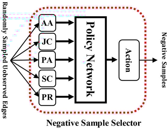 The randomly sampled unobserved edges are sequentially input into the negative sample selector. The negative sample selector obtains state vectors of the randomly sampled unobserved edges and feeds the state vectors into the policy network. According to the actions output from the policy network, high-quality negative samples are selected from the randomly sampled unobserved edges to compose the negative sample set . The state vectors and actions of the randomly sampled unobserved edges are recorded to update the parameters of the policy network.