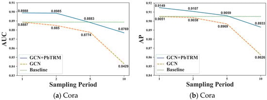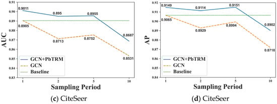 In this experiment, we study the influence of the sampling period on the proposed PbTRM. The prediction performance of the GCN+PbTRM model is compared to its benchmarking GCN model by searching the value in a range of . The value for the benchmarking GCN model means that the negative samples in its training set are updated by randomly sampling unobserved edges after finishing training epochs. To illustrate the effectiveness of the proposed PbTRM, the prediction performance of the benchmarking GCN model, whose value is set as 1, is used as the baseline performance. The experimental results are illustrated in Figure 4a–d.