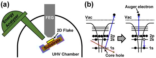 In this work, nano-AES (n-AES), the high-resolution version of AES, was employed for the chemical analysis of ML-MoS2 for several advantages. As described in Figure 1a, the n-AES is equipped with a field emission gun (FEG) scanning electron microscope (SEM) as an electron beam source, which enables sub-micron lateral resolution of ~10 nm, much higher than those of XPS and SIMS. Moreover, a sample can be measured as it is on the n-ASE system without any additional laborious and costly sample preparation process that may result in damage and contamination. In addition, since the n-AES system is equipped with the SEM imaging capability, micro-size mechanically exfoliated ML-MoS2 flakes and even their internal structures can be accessed for spectra acquisition in the accuracy of sub-micron. The chemical properties of a variety of low-dimensional materials and nanostructures were probed by n-AES previously [25,32,49,50]. As displayed in Figure 1b, the Auger electrons are ejected by a two-step and three-electron process called the Auger effect. First, the core hole is created by the incidence beam of electrons (or photons for other cases). Then, an electron fills the core hole by the internal transition losing an amount of energy. If the transition energy is large enough to release another electron at the second outer shell, the electron can be ejected. The ejected electron, called the Auger electron, has the kinetic energy () as , where is the core hole energy level and and are the binding energies of the first and second outer shells, respectively [45].