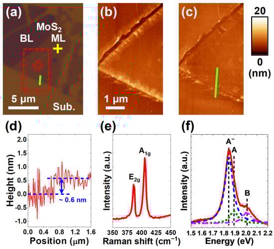 As shown in the optical microscopy (OM) image of Figure 2a, several MoS2 flakes were prepared on a SiOx/Si substrate by the mechanical exfoliation method, and one of the MoS2 flakes was chosen for the FLI process. By comparing the contact mode, AFM images scanned from the region of the MoS2 flake, including the irradiation spot before and after the FLI process, as shown in Figure 2b,c, respectively, the surface of the MoS2 flake was found to be not damaged without any sign of significant decomposition of MoS2. Previously, J. Ru et al. demonstrated that the MoS2 films could be thinned by FLI [18]. In this work, by the gentle FLI process, only the contaminant residue along the edges of the flakes was observed to be removed, probably along with the creation of defects that is discussed later. In Figure 2d, the line profile across the MoS2/SiOx boundary extracted from the AFM image in Figure 2c shows that the MoS2 flake is ~0.6 nm thick and, therefore, ML-thick [2].