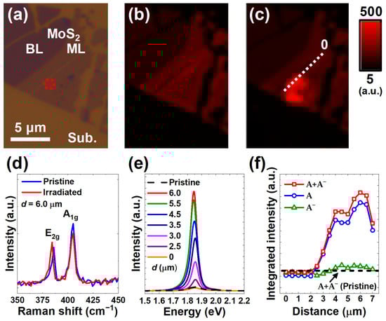 A set of PL spectra were successively measured with the interval of 0.5 μm along the white dashed line in Figure 3c, moving the focused-laser spot from the origin 0 to the spot of 7.0 μm across the irradiated region. In Figure 3e, the representative PL spectra indicate that the ambient PL intensity was enhanced up to ~1500% in the vicinity of the irradiation center. The variation in the integrated PL intensities of A and A− peaks, and , and their sum, , are plotted with varying in Figure 3f. As expected, the substantial enhancement of the ambient PL intensity by the FLI process was likely to be caused by the defect-assisted evolution of A radiation represented by the sharp increase in near the irradiated spot, consistently with a similar laser process as well as other various defect creation methods, including global annealing, irradiation with alpha particles and electrons, etc. [7,25,26,32,33,36,37,38]. Further, in terms of the spectral fractions of A and A− peaks given in Figure 3f, the competitive contributions from and radiations to the ambient PL could be evaluated (Figure S2). In the un-irradiated region ( 2.5 μm) at some distance away from the irradiation spot, the A− radiation was dominant with the average spectral fraction of A− peak of ~71.5%, well consistently with that measured before the FLI process of ~74.9%. However, once the laser-treated region was reached with increasing , the spectral fraction of A peak increased abruptly, indicating the transition of A− to A. The average spectral fraction of A in the irradiated region ( 2.5 μm) was found to be ~87.6%, much larger than that of the pristine ML-MoS2 of ~18.4%. On the contrary, A− peak shows an average spectral fraction of only ~12.1% in the irradiated region, while ~62.0% in the pristine ML-MoS2. These results verify that the contribution of A recombination became overwhelming as the irradiation center was approached. The point defects, such as S vacancies, may interact with O2 and H2O molecules in the air resulting in the electron transfer from ML-MoS2 to the gas molecules [7,25,26,37]. Therefore, the increase in the amount of S vacancies by the FLI process leads to the augmentation of p-type doping effects accompanied by the active conversion from A− to A, consistently with previous defect engineering studies on ML-MoS2 [7,25,26,32,33,36,37,38]. The slight shift of the PL peaks to the lower energy is observed in the highly defective region of ML-MoS2, such as micro-cracks [26]. As shown in Figure 3e, the slight red-shift of the ambient PL peaks by ~0.04 eV was observed, indicating that the highly defective area was created area-selectively by the FLI process.