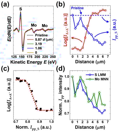 N-AES analyses on the ML-MoS2 irradiated area selectively using a focused laser beam: (a) A set of representative n-AES spectra in the derivative form of vs. where and are the kinetic energy and the number of detected Auger electrons, respectively. These spectra were measured successively by moving the focused e-beam along the white dashed line in Figure 3c from the origin 0 to the spot of ~6.41 μm across the irradiated region. (b) The variations in and the peak-to-peak intensity of S LMM Auger signal, . (c) The data plot of vs. normalized to the value at . To match the two sets of data set for the same values, corresponding to the values for the data are given by linear interpolation. Note that the red-dashed curve is drawn only for guidance. (d) The changes in normalized peak-to-peak intensities, s, of S LMM (150.0 eV) and Mo MNN (186.5 eV) Auger signals with . For a comparison, (a,b) include the data measured from the un-irradiated region of pristine ML-MoS2.