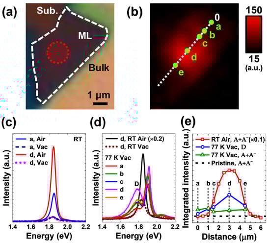 In order to elucidate the defect-driven effects more clearly, a set of low-temperature micro-PL experiments were also carried out on another area-selectively irradiated ML-MoS2 flake displayed in the OM image of Figure 5a. As shown in Figure 5b, the map of of the ambient PL acquired on the ML-MoS2 flake after the FLI process shows the local enhancement of PL, similar to the previous results. The five positions a-e in Figure 5b were measured as the ML-MoS2 sample was loaded in the cryostat. In Figure 5c, the two pairs of PL spectra were measured in positions a (almost pristine region) and d (close to the irradiation spot) at RT in air and vacuum after gentle annealing at ~400 K, respectively. In a vacuum, both the two positions showed very low PL intensity with similar PL characteristics since the A radiation was suppressed in the absence of the interplay between S vacancies and O2 and H2O molecules in the air, as also observed in the previous studies [7,26,32,37]. However, once the ML-MoS2 was exposed to air, both two positions showed the augmentation of PL intensity but by different amplitudes. The variation in PL modulation in terms of was observed to be much large in position d than in position a by 2.5 times. The reason why the un-irradiated region also showed the modulation of PL as environment conditions would be the existence of thermodynamically native point defects such as S vacancies [7,25]. These results imply that the defect engineering by the FLI process may be available for enhancing the air gas sensing capability of ML-MoS2 as well as tuning its electronic state and optical properties.