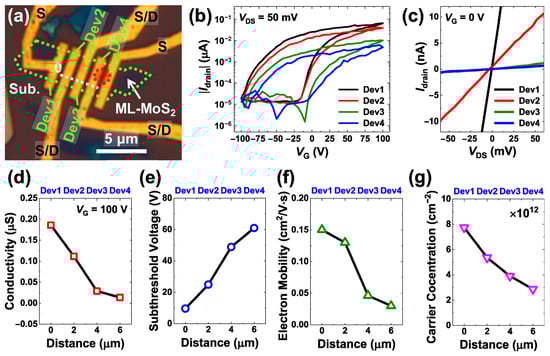 Variations in field-effect transistor (FET) characteristics of ML-MoS2-based FET devices by the area-selective FLI process: (a) An OM plan-view image of the four FET devices (Dev1–4) based on a single ML-MoS2 flake. The red dashed circle indicates that the irradiation center was located inside the Dev4 channel. (b) The drain current vs. gate voltage ( vs. ) curves measured from the devices at the drain-to-source voltage () of 50 mV. (c) The set of vs. plots of the four devices at 0. From the vs. data in (b), the following important device parameters and electronic properties of the ML-MoS2 channels can be extracted: (d) channel conductivity () at 100 V, (e) subthreshold voltage (), (f) electron mobility (), and (g) electron carrier concentration (). The distance d in (d–g) indicates the locations of the Dev1–4 along the dashed line parallel to the channel length from the origin 0 in the center line of the Dev1 channel as described in (a). Note that in (g), the values should be multiplied by 1012.