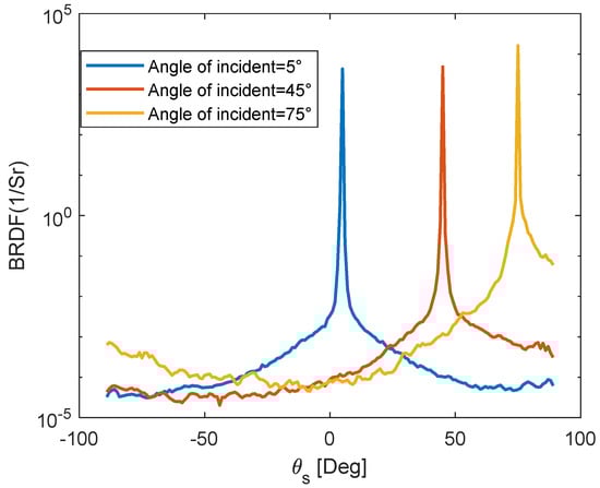 The angle-resolved scattering measurement is a typical non-contact method. It has proven to be an effective method to determine surface roughness from the above discussion. An important condition is that, for roughness determination, the scattering should be solely caused by roughness. It should not be due to particulate contamination or local defects such as scratches, sleeks or digs. The sample is measured with a table-top system for light scatter measurement (Albatross-TT) [15]. The angles of incidence are 5°, 45° and 75°, respectively. The scattered angle ranges from −85° to 85° and the wavelength is 1064 nm. The results are presented in Figure 5.