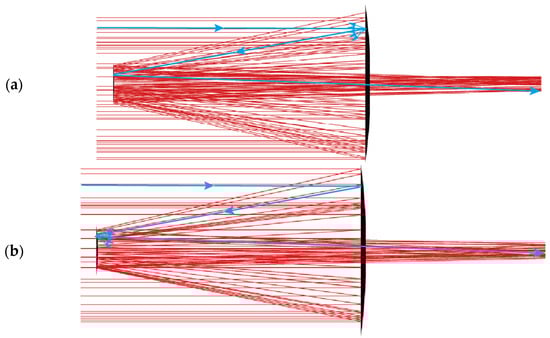 When considering the scattering caused by roughness, the BRDF was introduced in the ray-tracing model and first-order scattering was computed for each mirror separately. The scattering of the primary and the secondary are separately considered. Figure 8a shows the scattering from the primary and Figure 8b shows the scattering path from the secondary. As can be seen, the scattering reaches the detector only when a certain distribution of direction and position is fulfilled. On the other hand, the roughness scattering is usually isotropic due to the random nature of the surface texture and the axis-symmetry of the Cassegrain telescope.