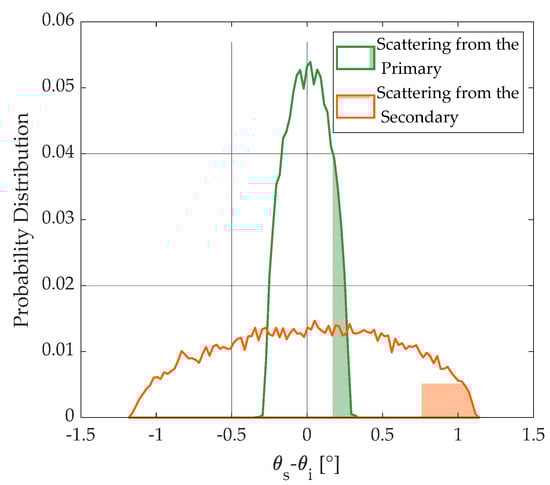 Because the local surface normal of a curved surface is different from different positions, it is reasonable to consider the angular deviation of the scattering path from the specular path. It makes sense because the BRDF of an isotropic surface is shift-invariant. Then, the BRDF curve should be shifted so that that the peak or the zero-deviation position is always in the direction of the specular path. A total of 30,000 scattered rays are picked out which originate from the primary and the secondary and reach the detector. For unit incident power, the scattering flux from the primary that reaches the detector is 1.05 × 10−5 W and for the secondary is 8.5 × 10−5 W. The deviation of each ray is recorded and plotted in Figure 9. which is the probability distribution indicating the angular distribution of the scattering that hits the detector. The green curve represents the deviation of the scattering from the primary while the orange represents the scattering from the secondary. It can be seen from Figure 9 that the scattering is evenly distributed around the specular beam for a rotationally symmetrical system. Furthermore, the histogram clearly shows that the scattering from the primary is more concentrated. The standard deviation of the scattering is 0.13° for the primary while for the secondary, the standard deviation is 0.56°. According to Equations (13) and (14), the ray transfer efficiency for the scattering of the primary is 2 × 10−5 while that for the secondary is 4 × 10−4. It shows that the scattering from the secondary has a larger possibility to reach the detector. The scattering from the primary is selected and only the scattering that is close to the specular light can reach the detector.