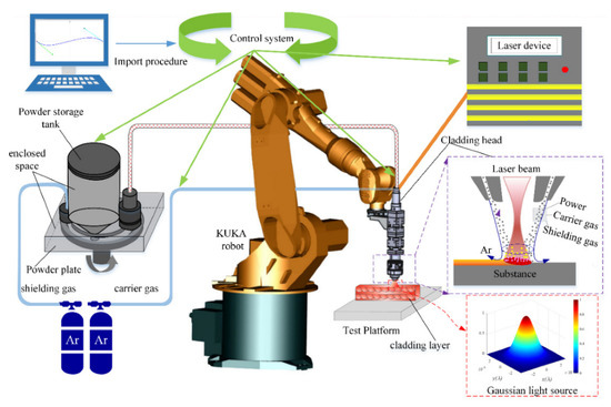 The LC system for the experiment is composed of the laser head, 6-axis KUKA robot, powder feeder, laser generator, water cooler, robot control system, and control cabinet, as shown in Figure 2. IPG YLR-500 fiber laser is employed to generate the laser beam, the wavelength of the laser beam is 1070 nm, and the maximum power is 500 W.