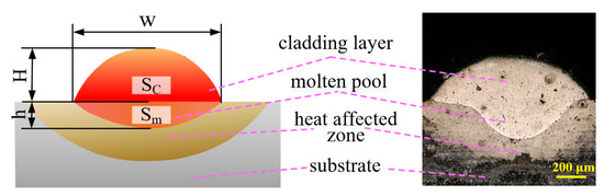 The geometry characteristics of the clad track are strongly influenced by the process parameters, as reported in [22,23]; among them, the dilution ratio β (the ratio of depth (h) and overall height (H + h)) is directly affected by the quality of longitudinal lap as Equation (1) [24]; the aspect ratio λ (the ratio of width (W) and height (H)) are directly determined by the quality of transverse lap as Equation (2) [25]. Sm and Sc in Equation (1) represent the melt pool area and the cladding layer area, respectively. Geometry characteristics are shown in Figure 3. The process parameters of LC, including powder feeding rate (Vp), laser power (P), scanning speed (Vs), and carrier gas rate (Q), are crucial for the geometry characteristics of LC coating [26,27,28]. Therefore, the four parameters were chosen as the key factors to find empirical–statistical correlations between the process parameters and geometrical characteristics. The four-parameter ranges were selected based on the parameters of existing experimental equipment and previous studies of the same equipment [16,29,30]. The dilution ratio β and aspect ratio λ was expected to predict the geometric characteristics. To select the ideal process parameters for the LC Ni60 alloy powder on 20CrMnTi substrate, a single-track orthogonal experiment and an interactive experiment were designed, as shown in Table 2 and Table 3.