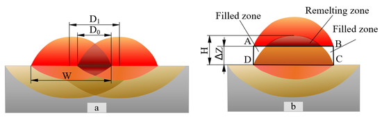The overlapping ratio, which includes the transverse overlapping ratio (δ) and longitudinal overlapping ΔZ, is shown in Figure 4a. The pores or less filled zone would appear in the cladding layer when δ is too small. However, when δ is too large, the material accumulation would occur, which reduces the deposition rate. Theoretical δ can be defined by Equations (3) and (4) [31]. According to orthogonal results, the average value of the cladding layer width of 18 tracks is 1.4 mm. Therefore, the distance (D1) between two adjacent tracks should be less than 1.4 mm. The laser spot diameter (d) is 1.0 mm, so the D1 should not be small. The D1 is selected as 0.6, 0.8, 1.0, 1.2, and 1.4 mm, respectively: