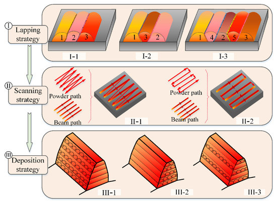 Morphologies of deposition layers under strategies I-1, I-2, and I-3 are shown in Figure 10. From Figure 10, the degree of surface flatness follows strategy I-1 > strategy I-2 > strategy I-3. The optimized cold strategy I-3 is the worst in surface flatness and the surface sticky powder is serious. The first reason is that LC is a process of rapid melting and rapid solidification. Strategy I-3 gives enough cooling time to the previous cladding path. When the cladding path was clad again, the location of the remelted zone changed. The previous cladding path largely played the role of the substrate, and then the height of the cladding was raised, and the remelting expansion zone was raised too. The flatness of the cold lap would be very poor, as shown in Figure 10b,c. The more thoroughly the cooling is raised, the more obvious the phenomenon that the adjacent cladding path is raised, and the more uneven the surface is. The other reason is that the cooling of the previous cladding path, the substrate area of the LC, needs to be larger, and then the energy consumption is relatively larger, resulting in low powder utilization and more powder scattered on the surface. Therefore, the cold lap sticky powder is also more serious.
