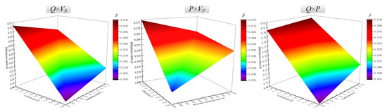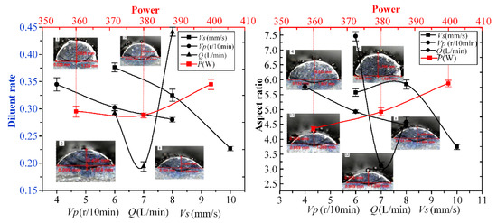Analysis of the results of orthogonal and interaction experiments use the range method. The results and analysis of the orthogonal experiment are given in Figure 6 and Table 4, where I, II, and III represent the average dilution rate values of the three levels of parameters, respectively, K1, K2, and K3 represent the average width–height ratio of three levels of parameters, respectively, and R represents the range. The magnitude of the range directly reflects the degree of influence of the factor on the parameter. Too low β will lead to poor metallurgical bonding between the current layer and the substrate or former coating. While too high dilution β will lead to serious remelting and influence the forming stability. The quality of the cladding layer is better when the dilution ratio is 20–30% [32]. When λ≫2, deposition efficiency is low. When λ < 2, the molten pool will exhibit high collapse sensitivity [33]. The “Rank” in Table 4 indicates the degree of the factor influence of the four parameters (P, VS, VP, Q) on β and λ. Based on the dependent variables β, λ, and the results of the analysis of the range method in Table 4, the order of importance of the effect of each parameter on β is , and the order on λ is . However, each parameter influences β and λ in a different order, it can be concluded that Q and VS are major factors, and P and VP are minor factors. The following parameters should be chosen: Q = 7 L/min, VS = 10 mm/s, VP = 0.8 r/min, P = 380 W, according to the results of the dilution rate range analysis. This situation is not special in orthogonal experiments [34]. The effects of different levels of each parameter on β and λ are fitted in Figure 6. From Figure 6, the Q ranges from 7 to 7.5 L/min, the Vs ranges from 8 to 10 mm/s, the VP ranges from 6 to 7 r/min, and the P of 380 W is suitable for both β and λ. So, interaction experiments were established and analyzed to further optimize the uniform parameters on β and λ.