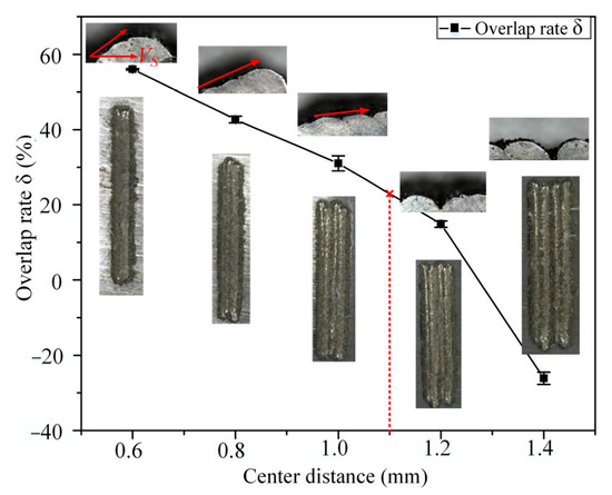 As shown in Figure 8, the overlap rate (δ) decreases as D increases. When D is 0.6 mm and 0.8 mm, the overlap joint of each coating layer is extremely obvious with the stacking phenomenon and forms the inclined surface. This phenomenon is the opposite direction of the sequence of cladding. There is an overlap gap between the channels instead of the inclined surface when the center distance is 1.2 mm and 1.4 mm. Overlap is an important reference parameter for the center distance; when δ is greater than 20% and close to 20%, it is easy to achieve a flat cladding surface [33,35]. When D is 1.0 and 1.2 mm, the surface flatness of the deposition layer is better. When D is 1.0 mm, the overlap rate δ1.0 is 32.43%. When D is 1.2 mm, the overlap rate δ1.2 is 15.49. Both δ1.0 and δ1.2 approach 20%. According to the linear change of diluent and center distance, δ1.1 is calculated to be 23.96% in the optimized scope. When D is 1.1 mm, it can make up for the insufficiency. In summary, the center distance is selected as 1.1 mm in this study.