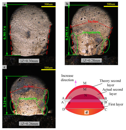 Figure 9 shows cross-sectional images of the six layers with lifting amounts (ΔZ) of 0.30 mm, 0.28 mm, and 0.26 mm, respectively. When ΔZ is 0.30 mm, the two sides of the cross-section of the cladding layer are relatively vertical, and the theoretical height is the closest to the actual height. The height error between the actual height and the theoretical height is 0.33%, which is much lower than 6.4% (Figure 9b) and 7.6% (Figure 9c). Figure 9b,c also have defects such as irregularity and increasing cladding width, which causes inclination of the cladding side. In general, the most appropriate ΔZ is 0.30 mm. Figure 9b,c are both in the case of ΔZ less than 0.30 mm. Thus, the lifting amount is less than the actual ΔZ. As shown in Figure 9d, the lifting amount is determined to ensure that the area of the rectangle ABCD is equal to the area of the first cladding layer. Thus, the area of the remelted part is equal to the sum area of the area AOD and the area BQC. When the ΔZ is relatively small, the second layer of cladding layer AMB becomes the cladding layer A’M’B’, and the remelting area changes from the area ONQ to the area PNR. The remelting area is much larger than the sum area of the A’PD and the B’RC. The excess cladding layer will first lead to the extension on both sides. As the number of cladding layers increases, the extension will become more obvious, forming the inclination of both sides of the cladding layer, as shown in Figure 9b,c. The second effect is to reduce the utilization rate of the powder. Therefore, there is a large amount of un-melted or micro-melting powder on the surface and edge of cladding paths, and even embossment appears, resulting in irregularities on both sides of the cladding layers in Figure 9b,c. When the ΔZ is small, the distance from the laser head becomes smaller. Therefore, when the next layer of LC is performed, the energy density will increase. This part of the increased energy is refracted and part of it is used for remelting. If there is remaining energy, the remaining powder can be utilized, so the actual height in Figure 9b is 6.4% higher than the theoretical height. Figure 9c is considered to increase the energy consumption of the remelting area, and the utilization rate of large powder is lower, resulting in a low energy utilization rate. Therefore, the actual height is 7.6% lower than the theoretical height.