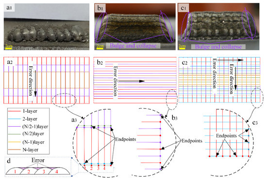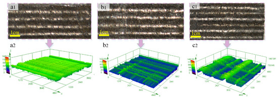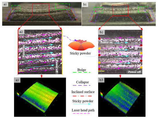 Figure 11 depicts the morphologies of deposition of nine layers under scanning strategies II-1 and II-2. A common phenomenon in Figure 11(a1,b1) is bulging and collapsing at both ends of the scanning route. It can be seen from the cladding path map. After beginning a path or completing a path, the coaxial powder feeding nozzle would be lifted a certain height in the Z-axis direction stopping briefly at the path endpoint. At this time, the powder will be continuously ejected from the nozzle (the laser is off). It is equivalent to the simultaneously proceeding powder-feeding LC and preset powder-feeding LC at both endpoints. Each layer will be slightly higher at the endpoints. When multilayer LC is carried out, the height difference of each layer will be superposed to form a bulge. On the other hand, when the nozzle stays at the endpoint of a just finished path, the continuous carrier gas and protective gas blowing to the molten pool will generate an impact effect on the liquid cladding layer, and the coating material will also bounce or fly out during the process, resulting in less powder entering the molten pool. Then, the liquid surface of the cladding layer will collapse under the action of gravity and surface tension. When multilayer LC was carried out, the collapse of each layer would be superposed to form an inclined surface at the end face. The obvious phenomenon is that the bulge and collapse are serious in the same directional scanning; the paper [36] also explains this phenomenon. The metal powder, carrier gas, and protective gas at both ends of the route have a larger amount of accumulation, so there is more powder to support bulging and more gas to support collapsing in the same directional scanning. Another reason is that the end point of one path adjacent to the starting point of the next route is on the same end face of the cladding layer in the reverse scanning. The collapse and bulge depressions alternately appear so the defects of collapse and bulge are complemented. In summary, the end face defects of the reverse scanning surface are not obvious.