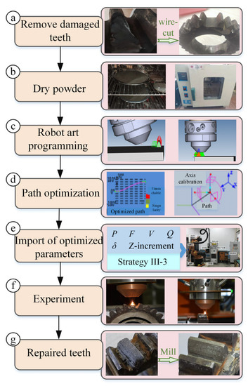 - Shi, J.; Bai, S.Q. Research on Gear Repairing Technology by Laser Cladding. Key Eng. Mater. 2013, 546, 40–44. [Google Scholar] [CrossRef]