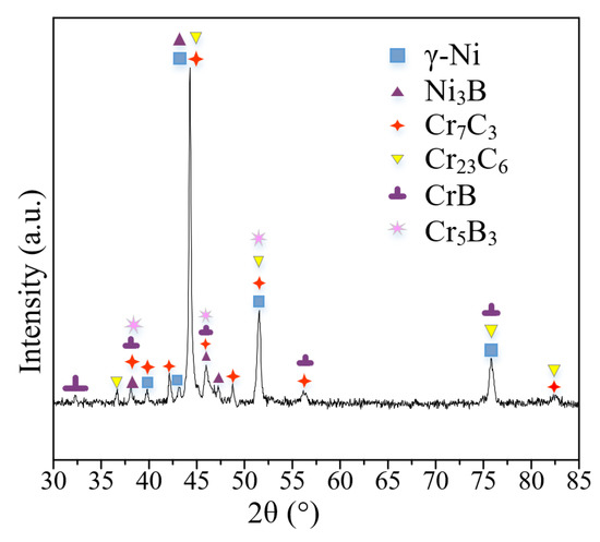 The phases of the sample image were derived from X-ray diffraction (XRD, X Pertpro) equipped with the Cu-Kα radiation at 2.2 kW. The samples were etched with 7 mL HF, 3 mL HNO3, and 5 mL H2O for 13 s. The microstructure morphology and element composition were obtained by scanning electron microscopy (SEM, ULTRA PLUS). SEM images were obtained by both backscattered electrons (BSE). BSE has the advantage of generating contrast based on atomic number, so it is easy to visualize due to being especially sensitive to boride and carbide precipitates. However, the BSE has a gap in properly distinguished fine Ni-B-Si eutectics with 100 nm thick layers and Ni solid solution dendrite.