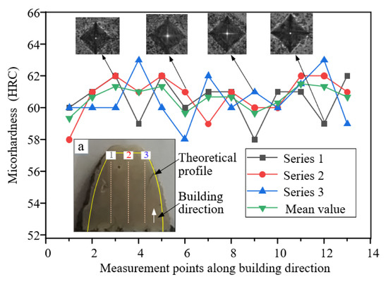 The main function of the gear is to transfer torque, adjust speed, and adjust direction, so the hardness of the repaired tooth should meet the use requirements. The repaired gear with too high hardness would be excessively worn to transmit unsteadily. The repaired gear with too low hardness will hardly adapt to the complex working conditions. With increased service time, the gear will be very “soft” and easy to wear. Therefore, it is necessary to ensure conditions of the repaired gear are similar to the hardness of other gear teeth. The hardness experimental results are shown in Figure 16; from series 1 to series 3, the data fluctuated in a small range without regular changes in the width direction. From the trend of its fluctuation, there is no obvious rule of hardness in the horizontal direction, and the fluctuation range is small, indicating that the hardness is stable in the horizontal direction. The average hardness of whole gear teeth is 60.63 ± 1.23 HRC. The average hardness of the three series is 60.54 HRC, 60.77 HRC, and 60.58 HRC, indicating that the hardness distribution in the whole cladding area tends to be stable, which is also close to the hardness of the other gear teeth.