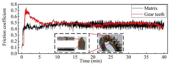 Wear performance is one of the most important macroscopic characteristics of the LC layer, which can be evaluated by friction coefficient, volume loss, and worn surface morphology [48,49,50]. The sample of the frictional wear test was obtained from the repaired gears, as shown in Figure 17. The friction coefficient curves of the substrate and gear teeth are shown in Figure 17. It shows that the friction coefficient is unstable initially, but it attained a stable value after about 10 min. This implies that the friction coefficient of the cladding layer and the substrate are similar. The average friction coefficient of the gear teeth is 0.49, which is 1.06 times of the substrate. Moreover, a stable coefficient of friction allows for the orderly removal of material from the deposited layer, resulting in a robust fatigue life.