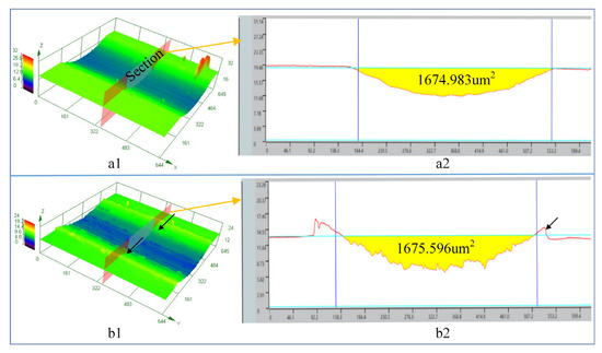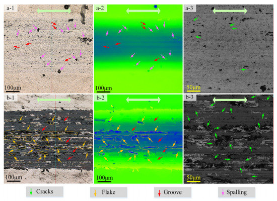 The volume loss of substrate and repaired teeth are shown in Figure 18a,b. The section area of repaired teeth is 1674.983 μm2 and the section area of the substrate is 1675.596 μm2. It indicates that wearing capacity is similar. Furthermore, obvious plastic deformation at the edge of the wear track is observed in the wear surface of the 20CrMnTi substrate, as shown in Figure 18(b1,b2). To reveal the wear mechanism, larger magnification optical images of each sample are shown in Figure 19. The large plastic deformation of the substrate would lead to rapid material removal and the formation of abrasive particles. As the slide continues, the abrasive particles micro-cut the substrate, and finally a large groove is formed on the worn surface, as shown in Figure 19(a1). There would be thermal effects and residual stresses in the deposited layer due to rapid cooling during LC [51,52]. The high and concentrated stress would promote the propagation of micro-cracks, as shown in Figure 19(a3,b3). As shown in Figure 19(a1,a2), the spallings and grooves are precipitated from the worn surface. Therefore, the wear mechanism of sample a is mainly abrasive wear [48]. The substrate peeled off many flakes or scaly flakes, so the worn surface is uneven, as shown in Figure 19(b2). The flakes of the substrate have greater volume, and they are easy to focus on peeling off, especially in the grooves. These flakes with no plastic deformation at the edge and some fatigue cracks are found inside the flakes, indicating that the wear is a typical sign of fatigue spalling. Therefore, the wear mechanism of sample a is mainly adhesive wear and fatigue wear [53,54]. As shown in Figure 19(a3,b3), most of the cracks in the substrate extended very seriously and gathered at the spalling and flakes. The cracks in the cladding layer were few, and their expansion of cracks is not serious. In summary, the wear performance of the cladding layer and the substrate is similar.