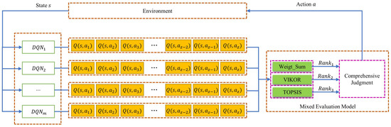 Figure 3 depicts the action selection procedure with several action-value functions. Each Q-Network is in charge of fitting the action-value functions of the corresponding objects. First off, each Q-Network receives an identical state s from the environment, and outputs to the Mixed Evaluation Model the corresponding action-value function vector , where z represents the number of actions and the Mixed Evaluation Model decides the final action to be executed.The two nonlinear ranking methods that are most widely used are TOPSIS and VIKOR. While VIKOR looks for the solution with the greatest group utility and the lowest individual regret value, TOPSIS seeks the compromise solution that is most closest to the ideal option. Given that both approaches have advantages, our model combines them.