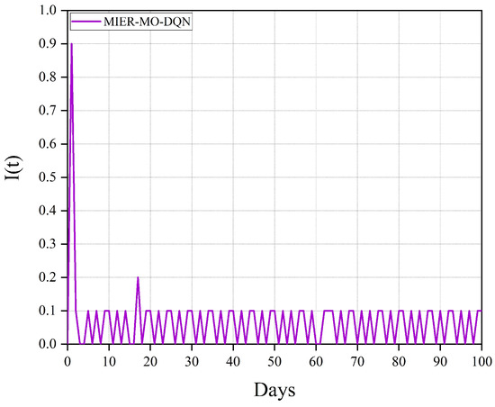 The change in the patient’s tumor cell count is shown in Figure 5a. The treatment was finished in 22 days due to the DQN algorithm’s rapid reduction in tumor cells. In comparison to W_DQN, the MIER-MO-DQN algorithm had a more favorable treatment outcome, with a roughly 18.7% gap in tumor cells at 100 days. Figure 5b,c shows the trends of effector-immune cell numbers and circulating lymphocyte in patients, respectively. The restrictions of Scenario 1 are violated by the DQN algorithm’s treatment plan, which calls for the continuous use of large dosages of chemotherapeutic drugs during therapy, leading to a rapid reduction in effector-immune cells and circulating lymphocytes as well. Though the W_DQN algorithm provided patients with larger quantities of effector-immune cells and circulating lymphocytes than MIER-MO-DQN, it does not pay enough attention to the efficiency of tumor cell reduction, and the poor efficiency of tumor cell decline results in an almost 300% longer treatment time than MIER-MO-DQN. We can observe that both the W_DQN algorithm and MIER-MO-DQN use low drug doses as the main usage regimen from Figure 5d, but MIER-MO-DQN will pursue the tumor treatment effect with high drug doses first and then maintain the patient’s other cell counts with low dosages. The drug use regimen for the first 100 days generated by the MIER-MO-DQN algorithm is shown in Figure 6. Table 3 shows that the MIER-MO-DQN algorithm outperforms other deep reinforcement learning algorithms in balancing the treatment of tumor cells and the maintenance of various other cell populations in the body.