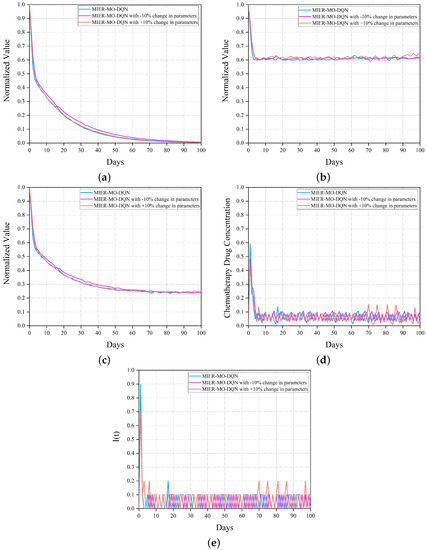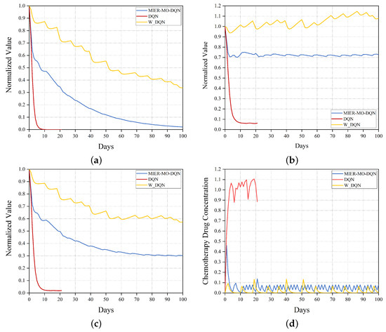 The changes in several biological indicators during the course of the treatment according to the chemotherapy regimens created using MIER-MO-DQN and other deep reinforcement learning algorithms are shown in Figure 5a–d. Each cell number in Figure 5 is normalized. Each method adheres to the restrictions of Scenario 1.