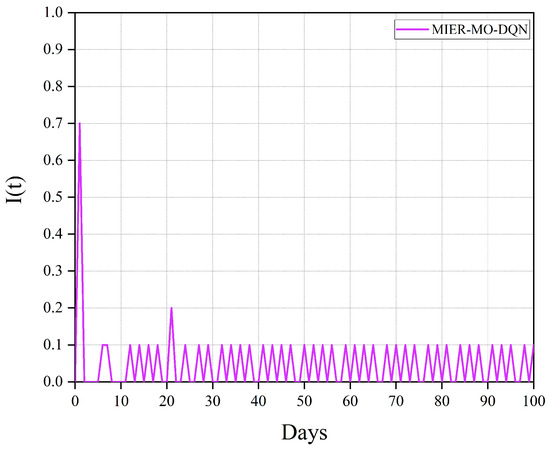 The drug use plan produced using the MIER-MO-DQN algorithm is displayed in Figure 8; Figure 9a–c depicts the cell populations as they change during the course of treatment using chemotherapy regimens created by MIER-MO-DQN and other deep reinforcement learning algorithms over a period of 100 days. Each regimen adheres to the restrictions of Scenario 2.