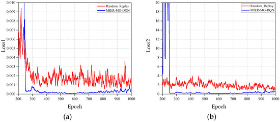 In this research, a multi-objective experience replay algorithm based on multiple indicators is proposed to address the problem of the slow convergence of the multi-objective deep reinforcement learning algorithm. We compare the multi-indicator experience replay with the random replay (Random_Replay) [36] under the constraint of Scenario 1 to illustrate the effectiveness of the multi-indicator experience replay applied to multiple objectives. The error between the current value and the predicted value needs to be extracted when adjusting the weights for various objectives of the DQN network, called Loss. Due to the fact that this article has two optimization targets, it will also produce two Losses. We can observe the changing trend of the losses throughout the experiment, and so we are able to roughly predict whether the method is close to convergence and the speed of convergence. We define the Loss of DQN for tumor cells as Loss1, and the loss of DQN for effector-immune cells as Loss2. The changes in Loss1 and Loss2 are shown in Figure 11a,b. It is clear that the MIER-MO-DQN approach exhibits greater fluctuations in the early iterations. This is because the size of the loss is mostly driven by the TD error, and the larger the TD error, the larger the loss. In fact, the multi-indicator experience replay mainly learns from the experience with the larger TD error and the information entropy of Q in the early iterations in order to speed up model convergence. The loss of the MIER-MO-DQN method is therefore initially much larger than the loss of the random method, but as the number of iterations rises, the loss of the MIER-MO-DQN method begins to become significantly lower than the loss of the random replay, and the loss1 and loss2 of the MIER-MO-DQN method always fluctuates within a particular range after 200 iterations without any greater change. Therefore, MIER-MO-DQN’s multi-indicator experience replay is more effective in this problem.