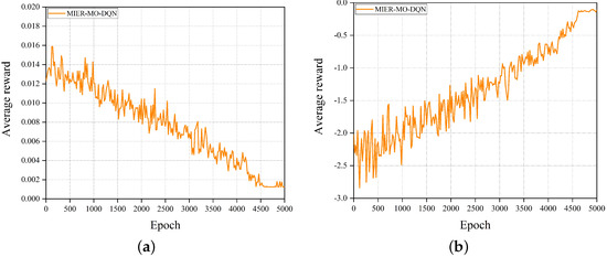 Another crucial indices of the deep reinforcement learning algorithm’s performance is the average reward. The average reward of the reward function during each iteration is shown in Figure 12a, and the average reward for throughout each iteration is also shown in Figure 12b. Because the effects of random strategy and action decision mechanisms are almost identical in the initial time, the average reward of is higher and the average reward of is lower in the initial time. The time of treatment gradually increases as the iteration rises, and as the action-value function becomes closer to the true value, the average reward of starts to decline while the average reward of exhibits a general increasing trend. After about 4600 iterations, the average reward of both approaches converges near zero. The MIER-MO-DQN algorithm has strong convergence in personalized dosing on the basis of the aforementioned experimental data.