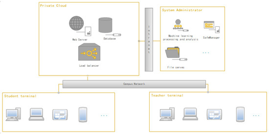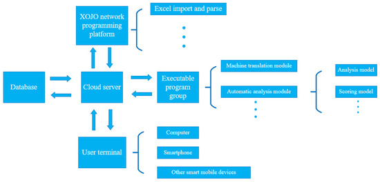 The cloud platform adopts the B/S architecture, takes the WEB browser as the client application software, and deploys the core part of the system function realization on the server, thus simplifying the use and maintenance of the system. The server side installs the MYSQL database, the NMT module and the automatic student performance evaluation module. They communicate with XOJO, and the necessary information is rendered on the web page for the user to view. This design makes the client application not restricted by the user’s system platform and can be expanded on the mobile platform. The system framework of the cloud platform is shown in Figure 3.