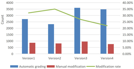 Before the first update, the system provided a total of 2715 final grades, of which 868 had to be manually modified by the teacher. Between the first update and the second update, the system provided a total of 2319 final grades, of which 811 had to be manually modified by the teacher. Between the second update and the third update, the system provided a total of 3597 final grades, of which 964 required manual revision by the teacher. Between the third update and the fourth update, the system provided a total of 3481 final grades, of which 765 had to be manually modified by the teacher. The change in the modification rate is shown in Figure 5.