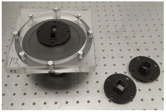 The circle, slot, and square orifices printed with PETG (polyethylene terephthalate glycol-modified) were fastened in the PMMA actuator body (Figure 1). The thickness of the orifice wall was 2 mm. The characteristic parameters of the SJ orifices are presented in Table 1. The diameter of the actuator cavity was 150 mm, and the height was 20 mm. The STX M.18.200.8.MCX loudspeaker with a nominal impedance equal to 8 Ω, sensitivity (2.83 V/1 m) equal to 89 dB, and a nominal resonance frequency equal to 37 Hz was used as an actuator in the SJA. The same actuator body, loudspeaker, and orifices were used in [26], where the characteristic frequency of the SJA was designated as Hz in the case of the circle and the square orifice and Hz in the case of the slot orifice.