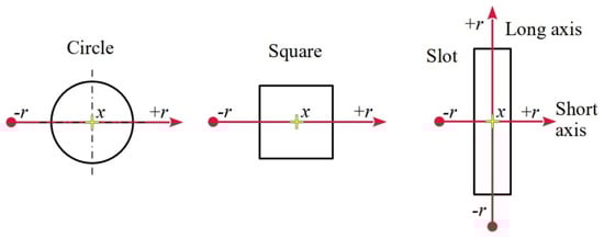 The coordinate system for various orifice shapes. The longitudinal direction is perpendicular to the page.