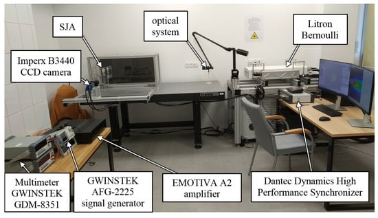 Instantaneous SJ velocity fields were measured by using PIV from Dantec Dynamics. The laser sheet was generated with the Litron Bernoulli series laser system with two pulsed and Q-switched Nd: YAG laser resonators, producing visible green 532 nm laser light. The laser had a maximum output energy equal to 200 mJ per pulse and a repetition rate equal to 15 Hz. The thickness of the laser sheet was approximately 1 mm. The laser sheet covers the camera field of view and passes through the orifice radial coordinate presented in Figure 2; the axial coordinate, x, passes through the orifice centerline and starts at the orifice exit plane. The images were acquired with an Imperx B3440 CCD camera with a sensor resolution of 3388 × 2712 pixels at 17 fps, and each pixel depth equals 12 bits. The camera used a lens with a 50 mm focal length, and the aperture was set to 1.8. The field of view is equal to 256 mm × 205 mm; thus, the resulting resolution for the digital image is 13.2 pixels/mm. A component of the PIV system was synchronized with the use of the Dantec Dynamics High-Performance Synchronizer with 32 independent outputs. The air was seeded with DEHS oil droplets with a nominal diameter of approximately 2 μm. The SJA was closed in a 1000 × 500 × 500 mm transparent box to prevent the spread of DEHS and to ensure adequate seeding concentration in the measuring area. Measurements were performed on the STANDA optical table equipped with vibration dampers. The entire test stand and its components are shown in Figure 3.