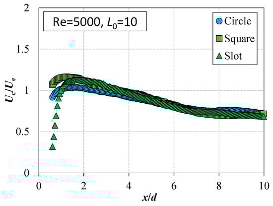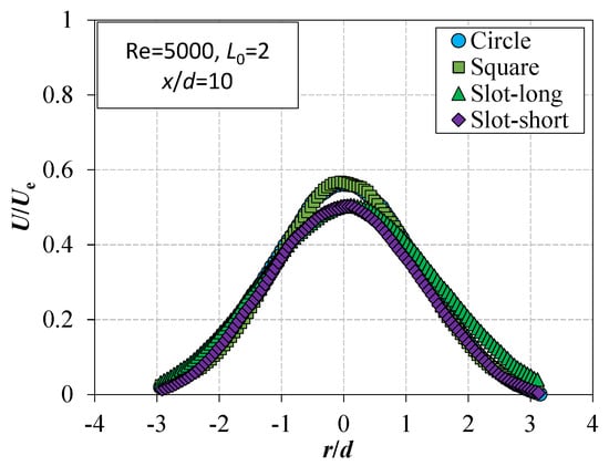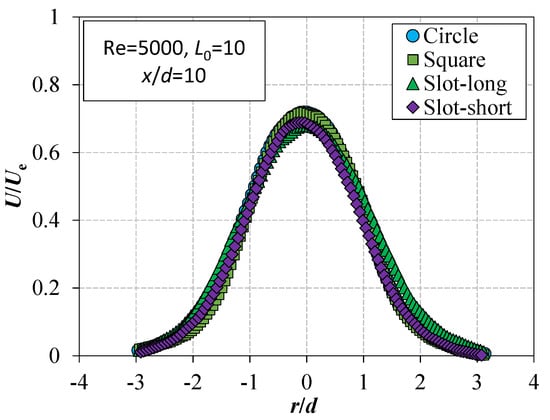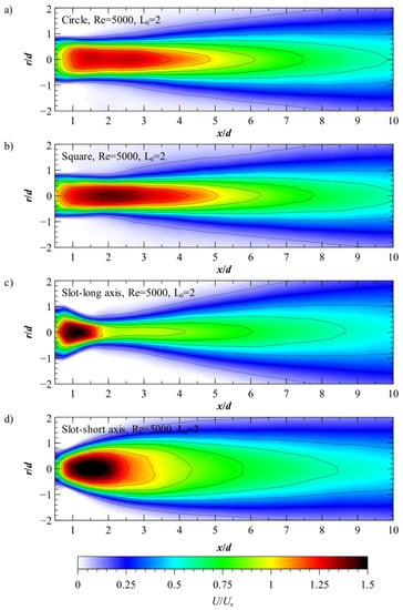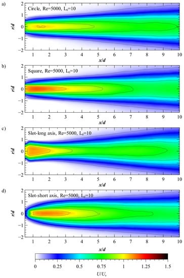 In Figure 5 and Figure 6, the dimensionless time-averaged velocity fields at and and 10 were presented, respectively. The velocity fields for the circle and square orifices are similar at the same dimensionless stroke length. In the case of the slot orifice, there are significant differences along the long- and short-axis velocity fields compared to the circle and square orifices. It must be noted that the characteristic velocity, , of SJ was the same in each case (Table 1). The change of the dimensionless stroke length, was realized by the change of the SJ operation frequency and the real power of the supply. The velocity component discussed in the present section was the time-averaged velocity in the x-direction.