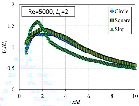 The centerline dimensionless time-averaged velocity was higher in the case of a square orifice than in the case of a circle orifice at a distance . The centerline velocity in the case of the slot orifice was the highest at and , but already at a distance of , it decreased below the value obtained for the circle and square orifice. The centerline time-averaged SJ velocity for a dimensionless stroke length equal to 10 has similar values and distributions for all investigated orifices for .