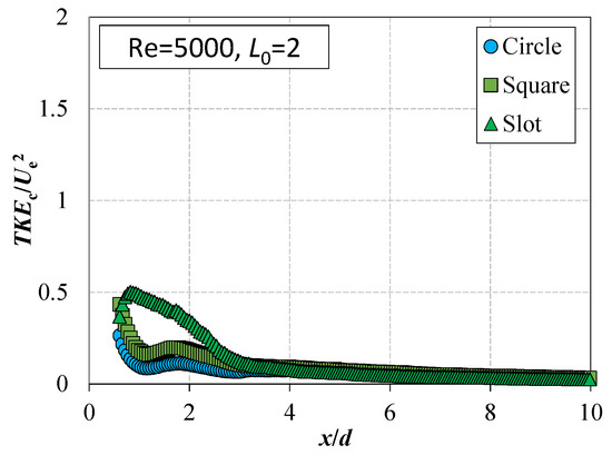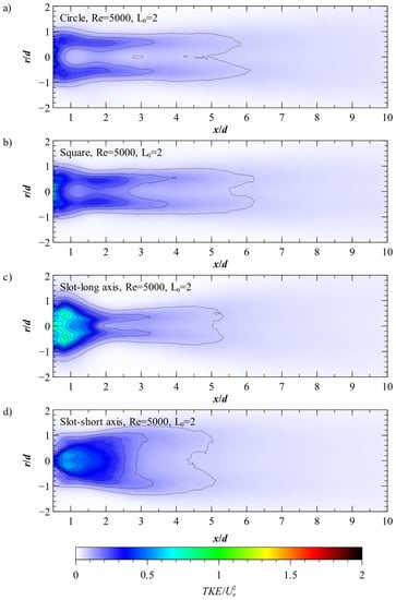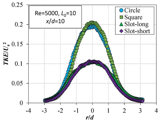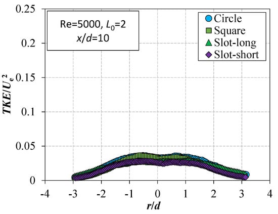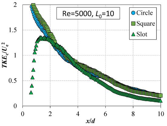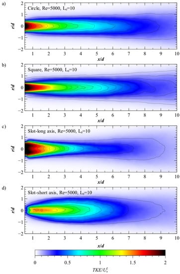 The dimensionless TKE fields of the SJ at and and 10 are presented in Figure 11 and Figure 12. The TKE for the circle orifice is presented in Figure 11a and Figure 12a; for the square orifice, it is presented in Figure 11b and Figure 12b; and for the slot orifice, in Figure 11d,e and Figure 12d,e. Additionally, the centerline distributions of the dimensionless TKE are presented in Figure 13 and Figure 14 for and 10, respectively. The TKE radial distributions at x/d = 10 are presented in Figure 15 and Figure 16.