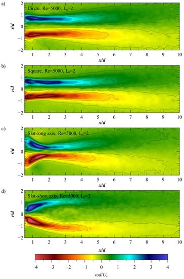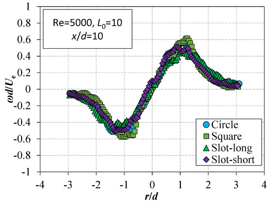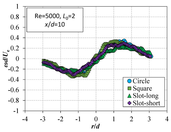 The time-averaged vorticity field of the SJ observed in Figure 17 and Figure 18 for the circle and square orifices (a and b) was typical. In the figures, we observed two axisymmetric fields with opposite values. These fields correspond to the areas at which the vortices propagate. The SJ coherent structure produces a high vorticity field. At the centerline, the time-averaged vorticity is equal to zero. The vortex ring had a similar shape to the circle and square orifices [12] in the axis on which the measurement was carried out (Figure 2). The difference in flow topology for the circle and square SJ is visible during the diagonal measurement, but these measurements were not carried out in the present study. The dimensionless vorticity was equal to or lower than 1 at a distance around for the circle and square SJs (Figure 17a,b and Figure 18a,b). Thus, it can be concluded that the coherent structure of the SJ was lost at this distance, but it did not mean the disappearance of vortices. The radial vorticity profile at a distance of (Figure 19 and Figure 20) showed that the maximal value of the dimensionless vorticity was equal to 0.3 (Figure 19, ) and 0.6 (Figure 20, ). The decrease in vorticity can be caused by the vortex ring coalescing caused by a high Reynolds number, which has already been observed by Carter and Soria [15]. They did not observe the ring coalescing at and . The investigated SJ had a lower Reynolds number but a higher Strouhal number, which also has a significant impact on topologies on the SJ. The effect of the coalescing of vortex rings at a certain distance from the orifice has also been observed by Dančová et al. [25] at and .