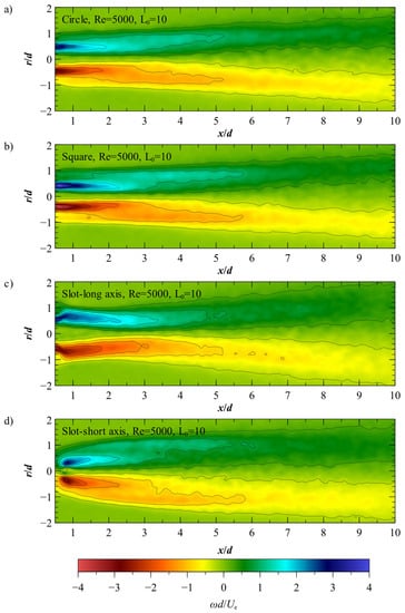 Synthetic jet dimensionless vorticity field at , St = 0.1, and L0 = 10: (a) circle orifice, (b) square orifice, (c) slot-long side, and (d) slot-short side.