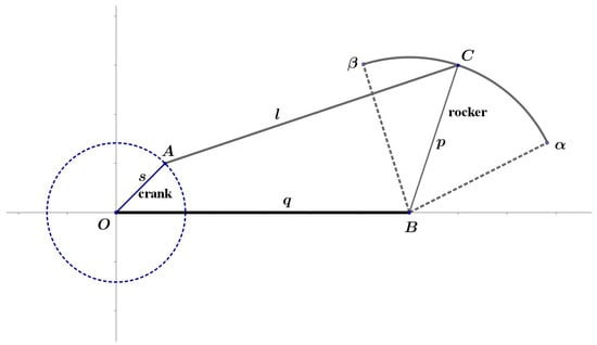 In Figure 1, the link OB is a fixed link with length . The link OA, with length , may rotates full 360 degrees and is called the “crank” of this linkage system. Usually the crank is driven by a motor. The link BC, with length , may only moves on a limited circular sector and is called the “rocker” of this linkage system. The link AC usually has the longest length and acts as the transfer link of this linkage system. Generally the Grashof law